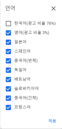 위 사진처럼 구글 애드센스 광고에서 나오는 언어가 모두 나오게 됩니다. 여기서 한국어를 제외한 모든 언어를 클릭하고 적용을 눌러줍시다.