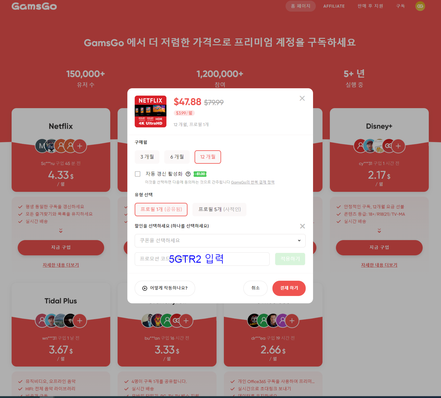 넷플릭스 겜스고로 최대한 할인 받고 구독하려면, 자동 갱신 활성화 + 프로모션 코드 5GTR2 입력 하시면 됩니다.